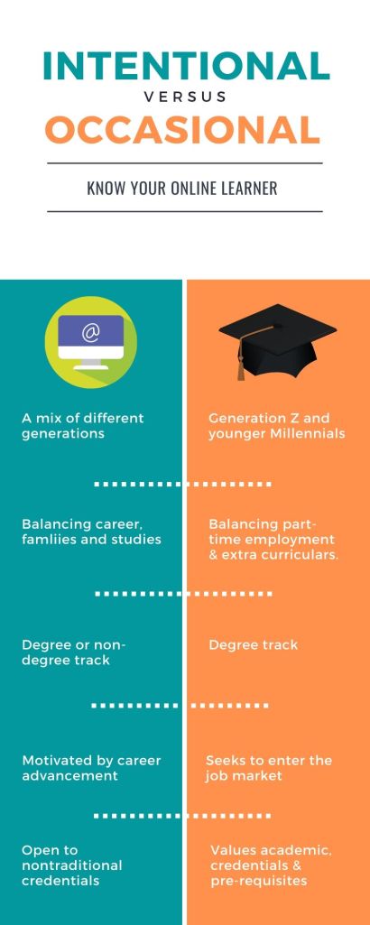 Perhaps the biggest difference between intentional and occasional online learners is their overall approach to education. After all, most online students have decided to forgo the typical college experience that is still highly valued by traditional college students. Think not only of tailgating, Greek parties and lazy rivers, but also all-nighters at the library, fascinating talks by an invited speaker, and study abroad opportunities. But the difference runs deeper than these superficial aspects of the college life, and engages with a complex set of values and goals. While they might be older anagraphically, intentional online learners embody the future of education: whether or not they are on a degree track, online students are more open to those non-traditional, stackable credentials that are the backbone of lifelong learning. On the other end, your traditional-students-turned-online-learners still value typical credentials, and see your college reputation and brand as the starting point for their professional journey. As you redesign your classes online, don’t lose sight of your students’ journey. Strive to maintain some of the characters of traditional education, in which your occasional online learner had invested time, money, and passion. Keep in mind that your class still needs to be plugged in a series of pre-requisites, leading to a certain body of knowledge; the pandemic will (hopefully) end, but your student’s degree will need to be valid beyond the next season.