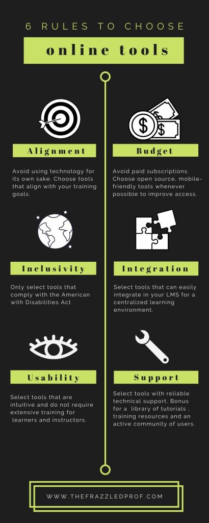 Here is an infographic I created, with my golden rules: six criteria that I follow when I need to select appropriate tools for an online course. Feel free to use it but do not forget to cite the source!